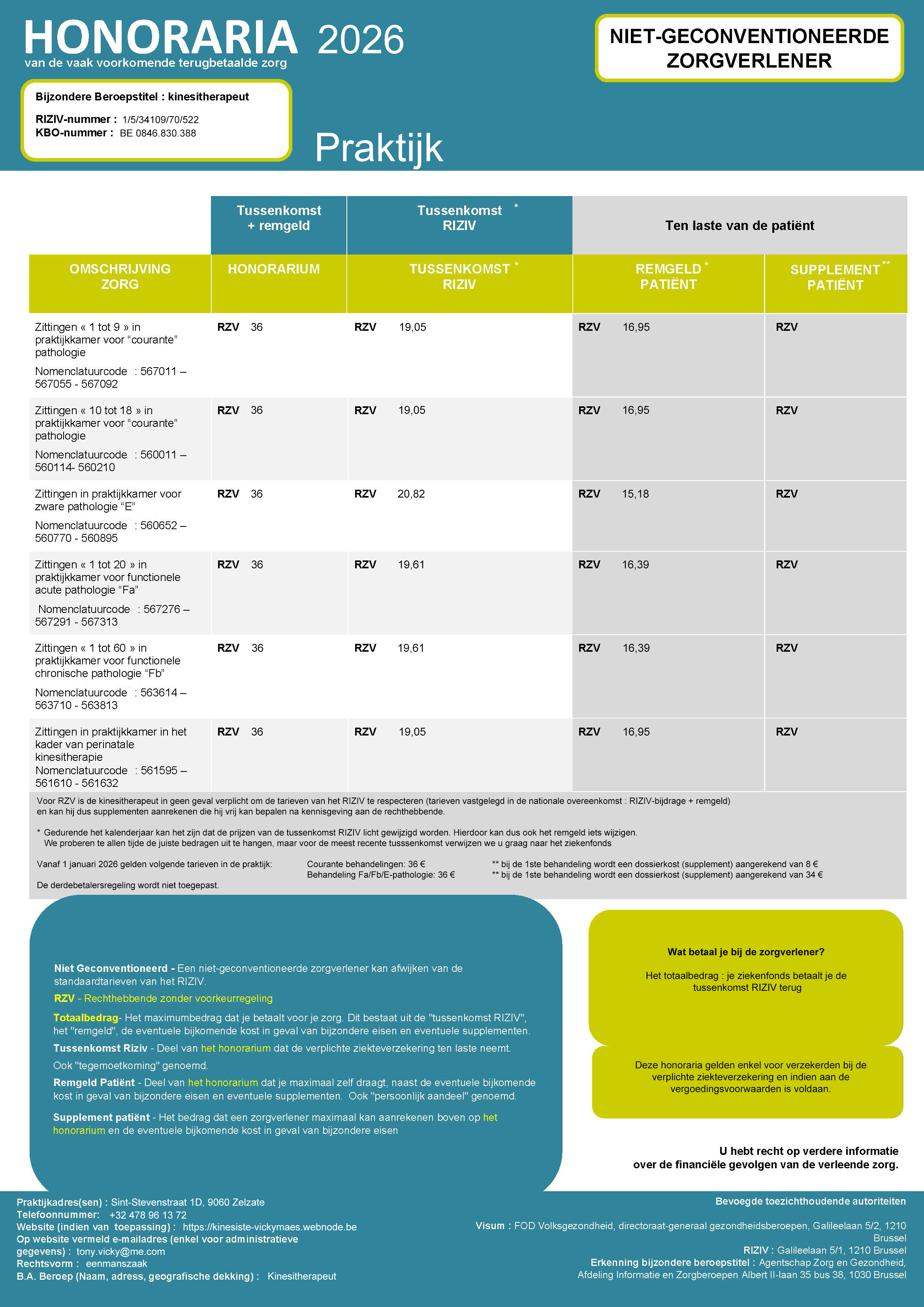 De kinesitherapietarieven in de praktijk zijn €36 per sessie, bij een eerste behandeling zal er een dossierkost aangerekend worden van €8 voor een courante pathologie en €34 voor een E/Fa/Fb-pathologie.