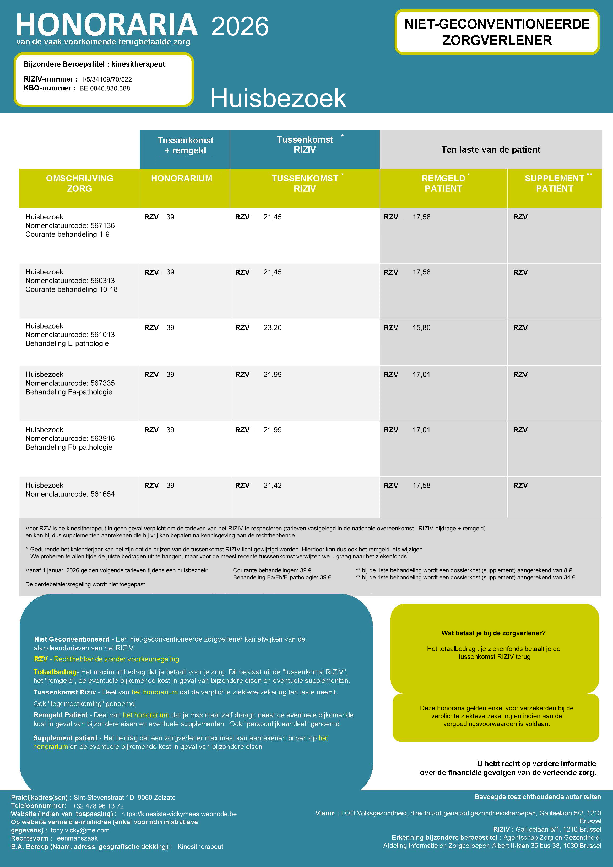 Zoals je kan zien kan de prijs variëren van €31,64 (=geconventioneerd) tot €42,5 of meer (=niet-geconventioneerd) voor een behandeling in de praktijk. Bij een huisbezoek komt er een kilometervergoeding bij en gaat de prijs van €34,8 tot €45 of meer.